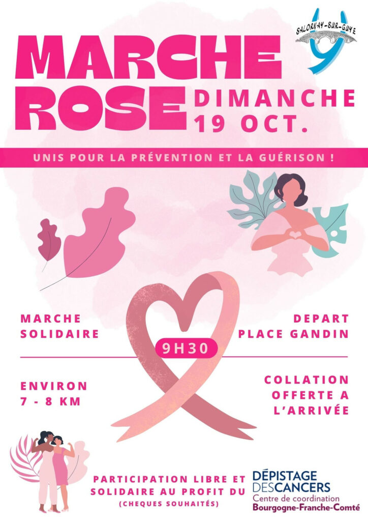 Dans le cadre de la sensibilisation à la prévention et au dépistage du cancer du sein, la commune de Salornay-sur-Guye organise une marche rose le Dimanche 19 octobre 2025 à 9h30, Place Gandin.