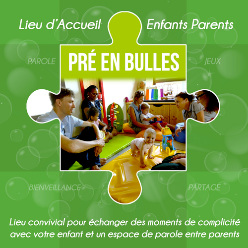 Il accueille les enfants de moins de 6 ans accompagnés d’un·e adulte référent·e (parents, grands-parents, beaux- parents, assistants familiaux). Pré en bulles propose aux enfants un espace de jeux libre, favorise sa socialisation et son autonomie en lien avec son parent. Ce lieu permet aux parents d’échanger, de partager des expériences avec d’autres parents et les accueillants.